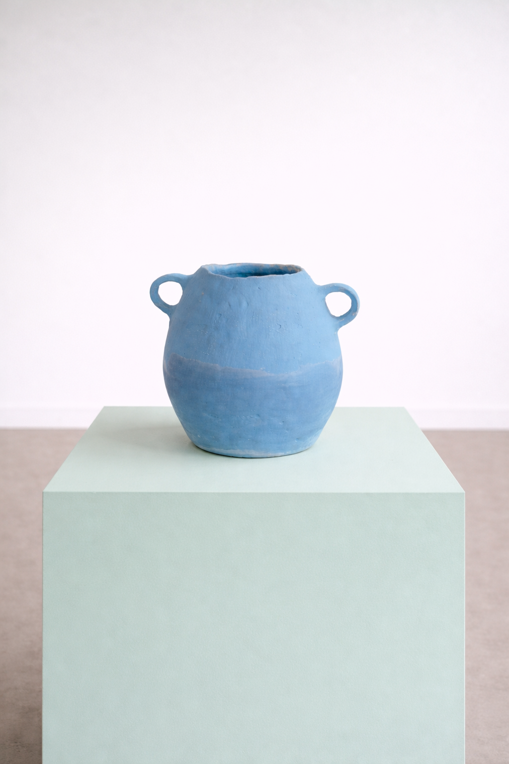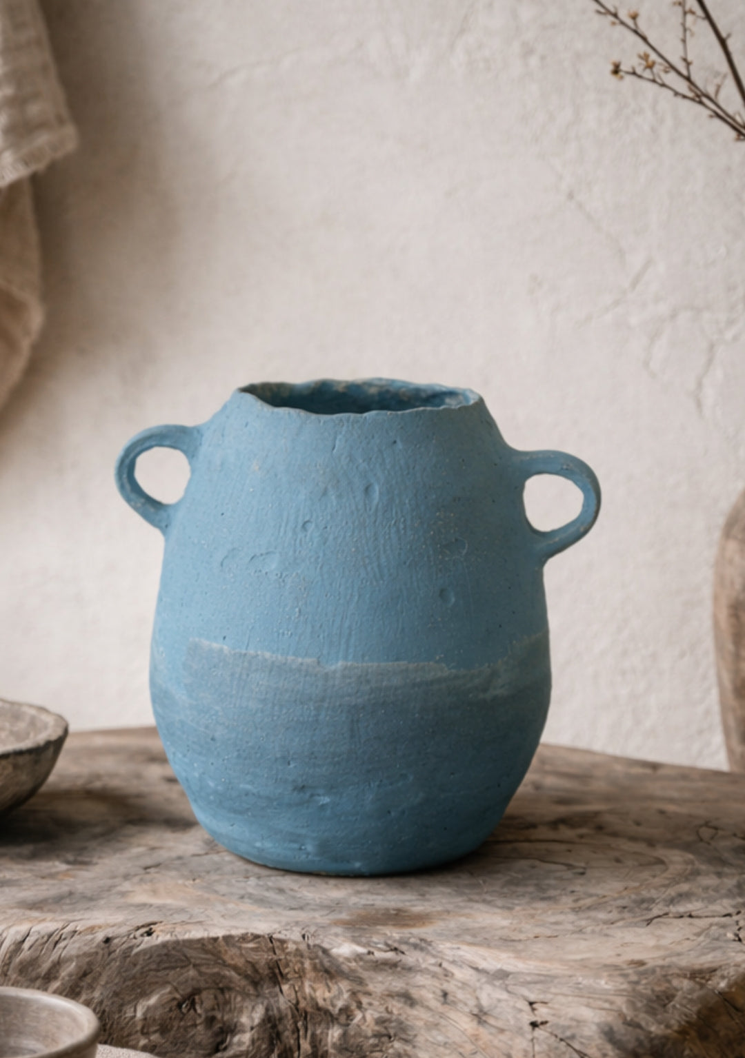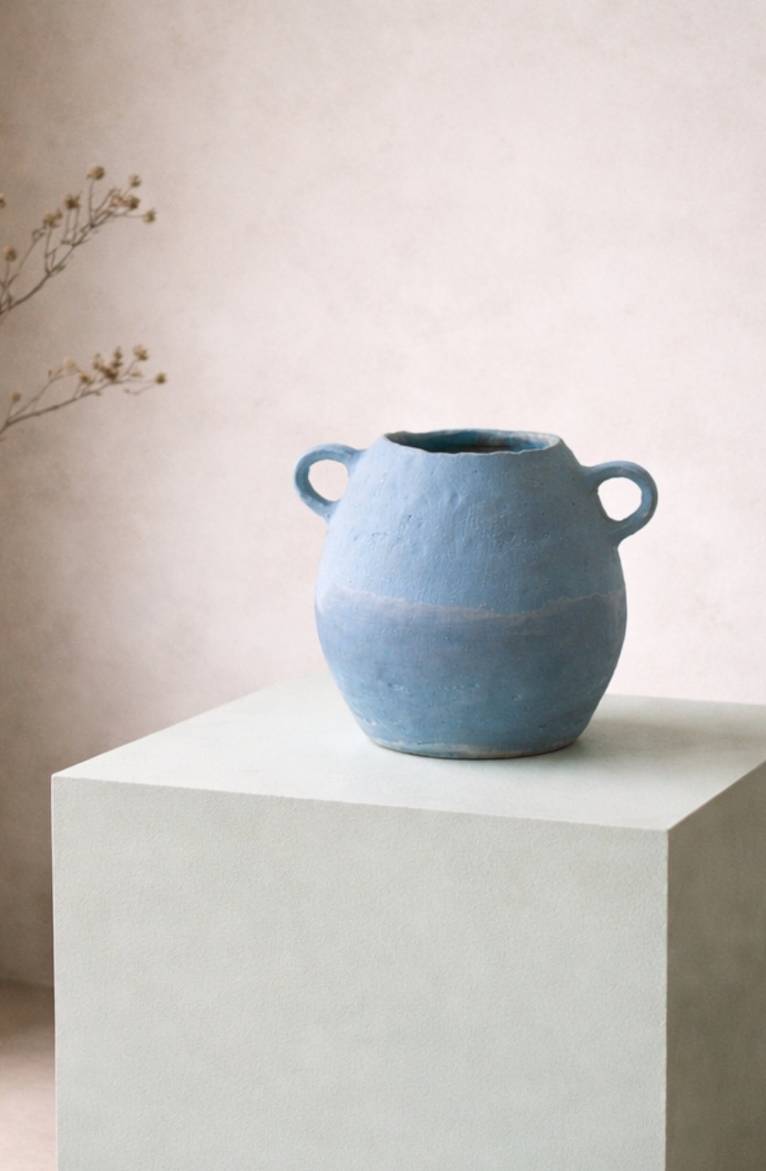 Ce vase en céramique artisanale séduit par sa forme organique et son fini mat délicatement texturé. Sa teinte bleue douce, inspirée des nuances minérales. Les deux petites anses latérales apportent un caractère authentique et sculptural à l’ensemble.