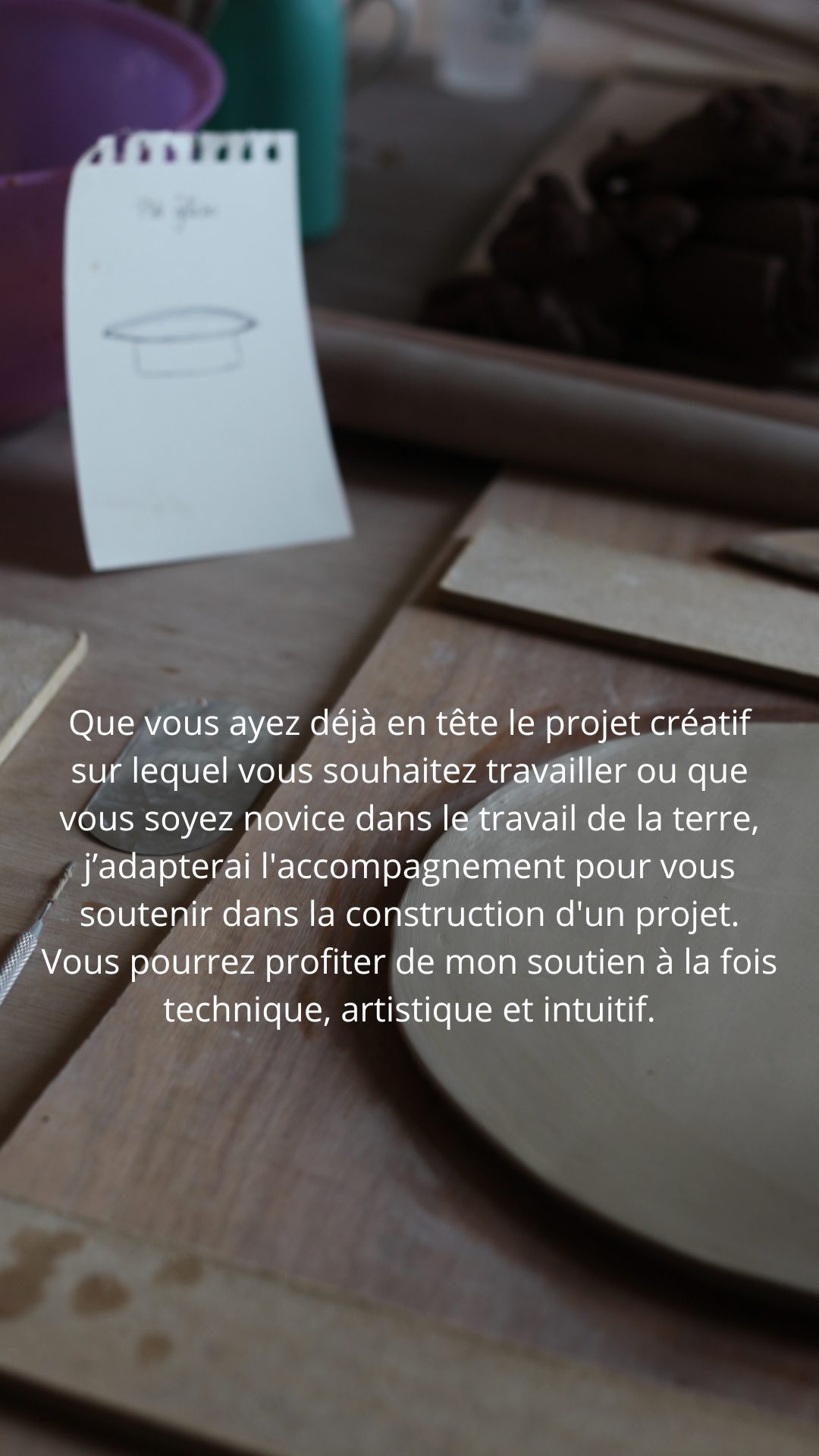 Que vous ayez déjà en tête le projet créatif sur lequel vous souhaitez travailler ou que vous soyez novice dans le travail de la terre, j’adapterai l'accompagnement pour vous soutenir dans la construction d'un projet. Vous pourrez profiter de mon soutien à la fois technique, artistique et intuitif.
